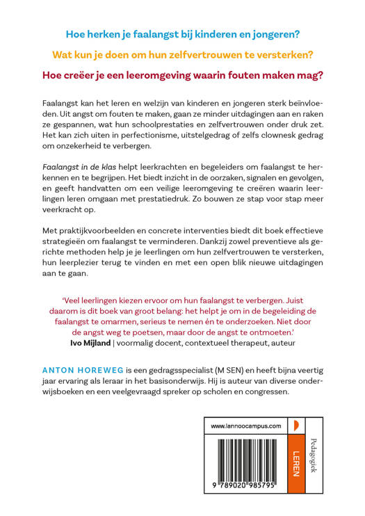 Hoe herken je faalangst bij kinderen en jongeren? Wat kun je doen om hun zelfvertrouwen te versterken? Hoe creëer je een leeromgeving waarin fouten maken mag? Faalangst kan het leren en welzijn van kinderen en jongeren sterk beïnvloeden. Uit angst om fouten te maken, gaan ze minder uitdagingen aan en raken ze gespannen, wat hun schoolprestaties en zelfvertrouwen onder druk zet. Het kan zich uiten in perfectionisme, uitstelgedrag of zelfs clownesk gedrag om onzekerheid te verbergen. Faalangst in de klas helpt leerkrachten en begeleiders om faalangst te herkennen en te begrijpen. Het biedt inzicht in de oorzaken, signalen en gevolgen, en geeft handvatten om een veilige leeromgeving te creëren waarin leerlingen leren omgaan met prestatiedruk. Zo bouwen ze stap voor stap meer veerkracht op. Met praktijkvoorbeelden en concrete interventies biedt dit boek effectieve strategieën om faalangst te verminderen. Dankzij zowel preventieve als gerichte methoden help je je leerlingen om hun zelfvertrouwen te versterken, hun leerplezier terug te vinden en met een open blik nieuwe uitdagingen aan te gaan.