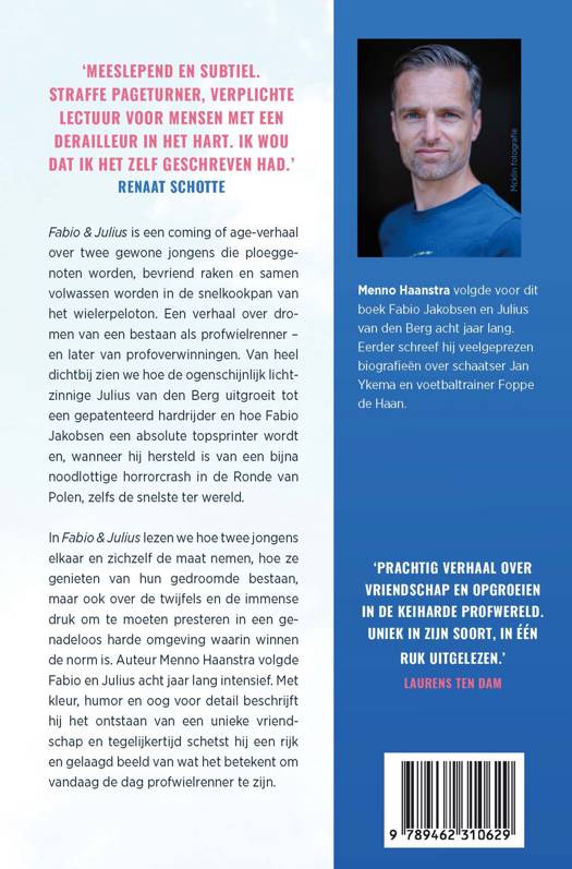 'Fabio & Julius' van Menno Haanstra is een coming of age-verhaal over twee gewone jongens die ploeggenoten worden, bevriend raken en samen volwassen worden in de snelkookpan van het wielerpeloton. Een verhaal over dromen van een bestaan als profwielrenner – en later van profoverwinningen. Van heel dichtbij zien we hoe de ogenschijnlijk lichtzinnige Julius van den Berg uitgroeit tot een gepatenteerd hardrijder en hoe Fabio Jakobsen een absolute topsprinter wordt en, wanneer hij hersteld is van een bijna noodlottige horrorcrash in de Ronde van Polen, zelfs de snelste ter wereld. In 'Fabio & Julius lezen we hoe twee jongens elkaar en zichzelf de maat nemen, hoe ze genieten van hun gedroomde bestaan, maar ook over de twijfels en de immense druk om te moeten presteren in een genadeloos harde omgeving waarin winnen de norm is. Auteur Menno Haanstra volgde Fabio en Julius acht jaar lang intensief. Met kleur, humor en oog voor detail beschrijft hij het ontstaan van een unieke vriendschap en tegelijkertijd schetst hij een rijk en gelaagd beeld van wat het betekent om vandaag de dag profwielrenner te zijn.