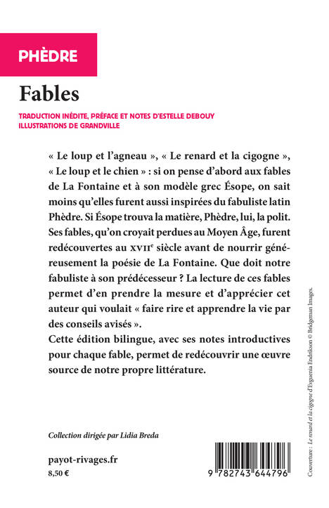 « Le loup et l'agneau », « Le renard et la cigogne », « Le loup et le chien » : si on pense d'abord aux fables de La Fontaine et à son modèle grec Ésope, on sait moins qu'elles furent aussi inspirées du fabuliste latin Phèdre. Si Ésope trouva la matière, Phèdre, lui, la polit. Ses fables, qu'on croyait perdues au Moyen Âge, furent redécouvertes auXVIIe siècle avant de nourrir généreusement la poésie de La Fontaine. Que doit notre fabuliste à son prédécesseur ? La lecture de ces fables permet d'en prendre la mesure et d'apprécier cet auteur qui voulait « faire rire et apprendre la vie par des conseils avisés ». Cette édition bilingue, avec ses notes introductives pour chaque fable, permet de redécouvrir une oeuvre source de notre propre littérature.