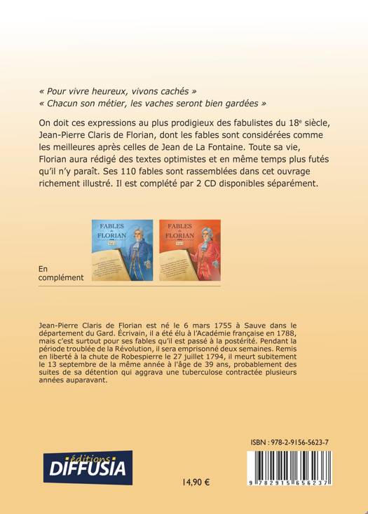 « Pour vivre heureux, vivons cachés », « Chacun son métier, les vaches seront bien gardées ». On doit ces expressions au plus prodigieux des fabulistes du 18e siècle, Jean-Pierre Claris de Florian, dont les fables sont unanimement considérées comme les meilleures après celles de Jean de La Fontaine. Toute sa vie, Florian aura rédigé des textes optimistes et en même temps plus futés qu'il n'y paraît. Interprétées par 7 voix et accompagnés de plusieurs morceaux de musique classique, ces 18 fables commentées enchanteront nos oreilles. Les 18 fables : Le chat et le moineau - Le rhinocéros et le dromadaire - Le bouvreuil et le corbeau - Les deux voyageurs - L'enfant et le dattier - Le bonhomme et le trésor - Le chat et les rats - L'enfant et le miroir - Le chat et le miroir - Les deux jardiniers - Le prêtre de Jupiter - La jeune poule et le vieux renard - L'écureuil, le chien et le renard - Les deux lions - Voyage - L'auteur et les souris - Le léopard et l'écureuil - Épilogue. Durée:47 min