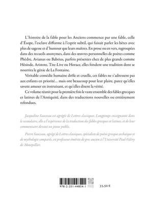 L'histoire de la fable pour les Anciens commence par une fable, celle d'Esope, l'esclave difforme a l'esprit subtil, qui faisait parler les betes avec plus de sagesse et d'humour que leurs maitres. En prose ou en vers, regroupees dans des recueils anonymes, dans des oeuvres personnelles de poetes comme Phedre, Avianus ou Babrius, parfois presentes chez de plus grands comme Hesiode, Aristote, Tite-Live ou Horace, elles fondent une tradition dont se nourrira le genie de La Fontaine. Veritable comedie humaine drole et cruelle, ces fables ne s'adressent pas aux enfants en priorite... mais ont beaucoup pour leur plaire, parce qu'elles savent amuser en instruisant, et qu'elles disent la verite. Ce volume reunit pour la premiere fois le vaste ensemble des fables grecques et latines de l'Antiquite, dans des traductions nouvelles ou entierement refondues.