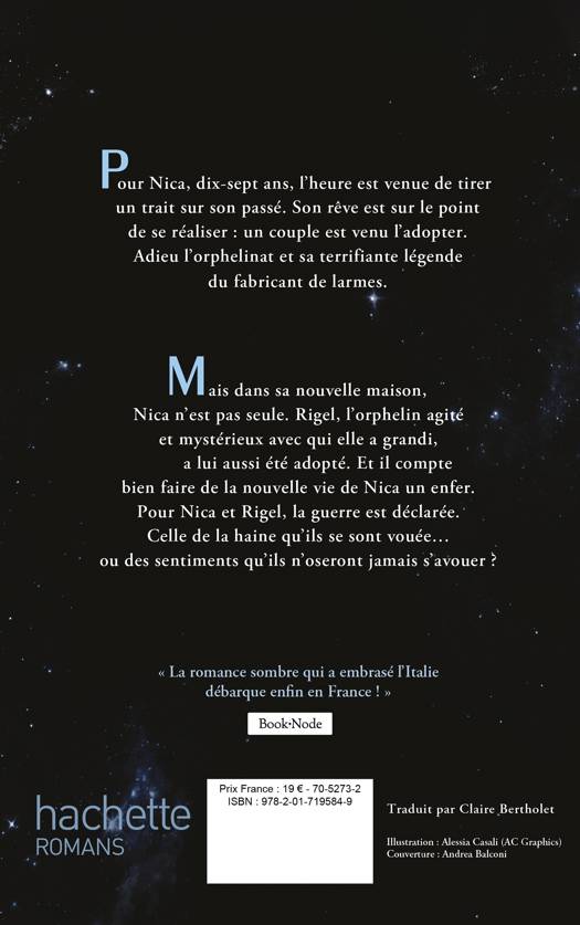 Pour Nica, dix-sept ans, l'heure est venue de tirer un trait sur son passé. Son rêve est sur le point de se réaliser : un couple est venu l'adopter. Adieu l'orphelinat et sa terrifiante légende du fabricant de larmes. Mais dans sa nouvelle maison, Nica n'est pas seule. Rigel, l'orphelin agité et mystérieux avec qui elle a grandi, a lui aussi été adopté. Et il compte bien faire de la nouvelle vie de Nica un enfer. Pour Nica et Rigel, la guerre est déclarée. Celle de la haine qu'ils se sont vouée... ou des sentiments qu'ils n'oseront jamais s'avouer ?