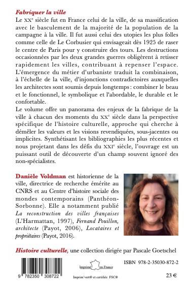 Le volume offre un panorama des enjeux de la fabrique de la ville à chacun des moments du XXe siècle dans la perspective spécifique de l'histoire culturelle, approche qui cherche à démêler les valeurs et les visions revendiquées, sous-jacentes ou implicites. Synthétisant les bibliographies les plus récentes et nous projetant dans les défis du XXIe siècle, l'ouvrage est un puissant outil de découverte d'un champ souvent ignoré des non-spécialistes.