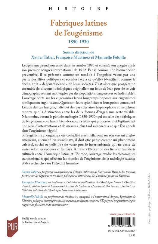 L’eugénisme prend son essor dans les années 1880 et connaît son apogée après son premier congrès international de 1912. Pensé comme une biomédecine préventive, il se présente comme un remède à l’angoisse vécue par une partie des élites politiques et sociales face à ce qu’elles identifient comme le déclin et la « dégénérescence » de leurs sociétés. C’est alors que prospère un ensemble de discours idéologiques originellement issus de leur peur de se voir démographiquement submergées par des populations dangereuses ou indésirables. L’ouvrage porte sur les eugénismes latins longtemps opposés aux eugénismes nordiques ou anglo-saxons. Quels sont leurs spécificités et leurs points communs ? L’étude des cas français, italien et des pays des aires hispanophone et lusophone montre que la distinction entre les deux formes d’eugénisme reste valable. Néanmoins, durant la période envisagée (1850-1930) qui est celle des « fabriques de l’eugénisme », ce furent bien des savants latins qui proposèrent et légitimèrent une série d’interventions et de mesures, plus tard ramenées à ce que l’on appela alors l’eugénisme négatif.