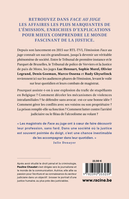 « Les magistrats de Face au juge ont à coeur de faire découvrir leur profession, sans fard. Dans une société où la justice est souvent pointée du doigt, c'est une chance inestimable de les accompagner dans leur quotidien. » - Julie Denayer