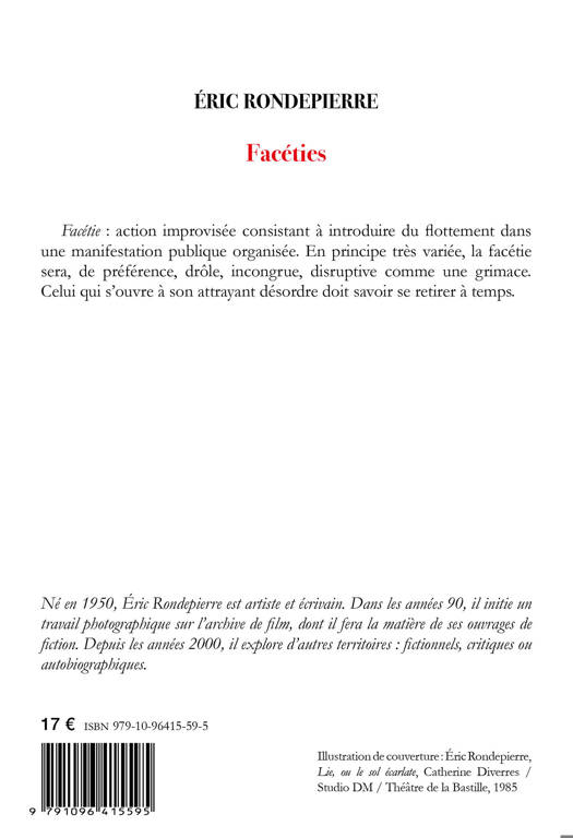 En deux parties d’inégale longueur, une fictionnelle (« Théorie de la grimace ») et une autobiographique (« Cirques divers »), Éric Rondepierre même une réflexion inédite et globale sur la notion de « facétie », ou grimace, qu’il définit ainsi : facétie : action improvisée consistant à introduire du flottement dans une manifestation publique organisée. En principe très variée, la facétie sera, de préférence, drôle, incongrue, disruptive comme une grimace. Celui qui s'ouvre à son attrayant désordre doit savoir se retirer à temps. Cette division en deux parties en fait une oeuvre littéralement coupée en deux : dans cette béance se tient tout son prix – son mystère, car aussitôt franchie, la fiction vient à notre rencontre.<br /><br /><br /> Le livre est imprimé en noir et blanc, avec une quinzaine d’illustrations.