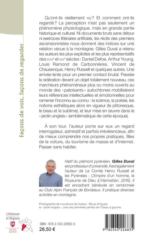 Les récits des premiers ascensionnistes nous donnent des indices sur une relation vécue à la montagne. Gilles Duval a retenu les auteurs les plus explicites et les plus représentatifs des XVIIIe et XIXe siècles : Daniel Defoe, Arthur Young, Louis Ramond de Carbonnières, Vincent de Chausenque, Henry Russell et quelques autres. Passée la sidération devant un objet totalement nouveau, ces marcheurs phénoménaux plus ou moins ouverts au monde des "patoisants" autochtones mobilisèrent leurs références intellectuelles et émotionnelles pour ramener l'inconnu au connu. A son tour, l'auteur porte sur eux un regard interrogateur afin de mieux comprendre nos propres pratiques, filles de la voiture, du tourisme de masse et d'Internet.