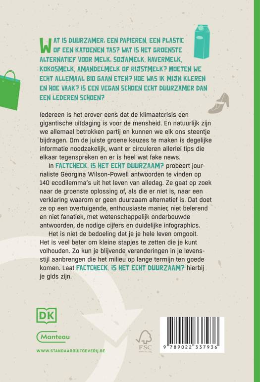 Iedereen is het erover eens dat de klimaatcrisis een gigantische uitdaging is voor de mensheid. En natuurlijk zijn we allemaal betrokken partij en kunnen we elk ons steentje bijdragen. Om de juiste groene keuzes te maken is degelijke informatie noodzakelijk, want er circuleren allerlei tips die elkaar tegen spreken en er is heel wat fake news. In Factcheck. Is het echt duurzaam? probeert journaliste Georgina Wilson-Powell antwoorden te vinden op 140 ecodilemma’s uit het leven van alledag. Ze gaat op zoek naar de groenste oplossing of, als die er niet is, naar een verklaring waarom er geen duurzaam alternatief is. Dat doet ze op een overtuigende, enthousiaste manier, niet belerend en niet fanatiek, met wetenschappelijk onder bouwde antwoorden, de nodige cijfers en duidelijke info graphics. Het is niet de bedoeling dat je je hele leven omgooit. Het is veel beter om kleine stapjes te zetten die je kunt volhouden. Zo kun je blijvende veranderingen in je levensstijl aanbrengen die het milieu op lange termijn ten goede komen. Laat Factcheck. Is het echt duurzaam? hierbij je gids zijn.