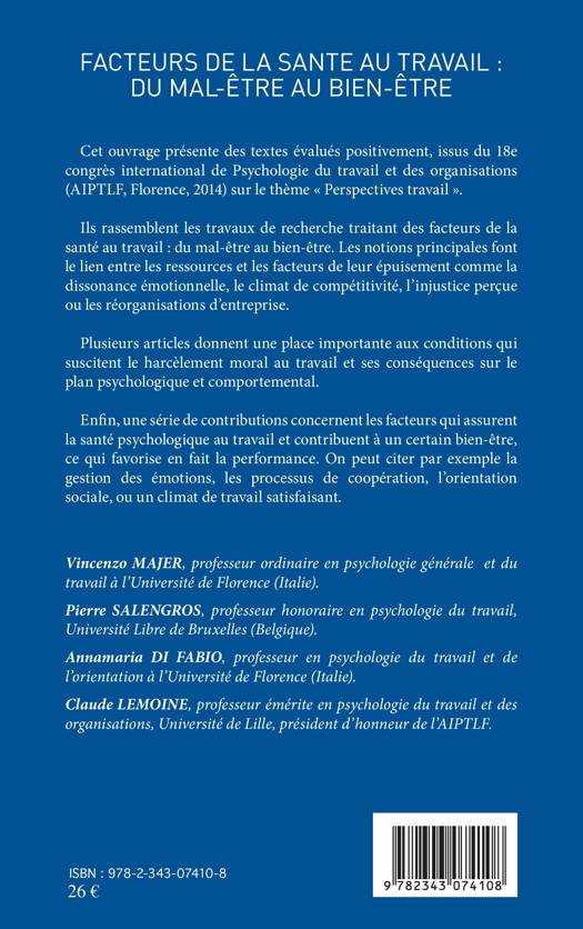 Cet ouvrage présente des textes issus du 18e congrès international de Psychologie du travail et des organisations sur le thème « Perspectives travail ». Il rassemble les travaux de recherche traitant des facteurs de la santé au travail. Plusieurs articles accordent une place importante aux conditions qui suscitent le harcèlement moral au travail et ses conséquences sur le plan psychologique et comportemental. D’autres concernent les facteurs qui assurent la santé psychologique au travail.