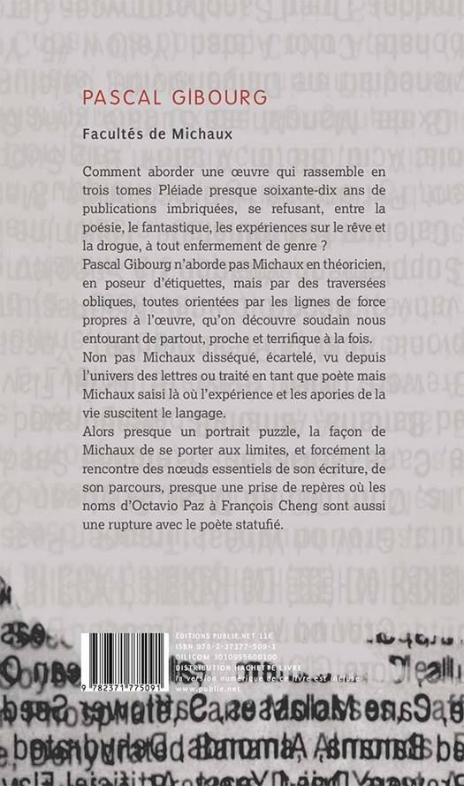Pascal Gibourg n’aborde pas Michaux en the oricien, en poseur d’e tiquettes, mais par des traverse es obliques, toutes oriente es par les lignes de force propres a l’oeuvre, qu’on de couvre soudain nous entourant de partout, proche et terri que a la fois. Non pas Michaux disse que , e cartele , vu depuis l’univers des lettres ou traite en tant que poe te mais Michaux saisit la ou l’expe rience et les apories de la vie suscitent le langage.