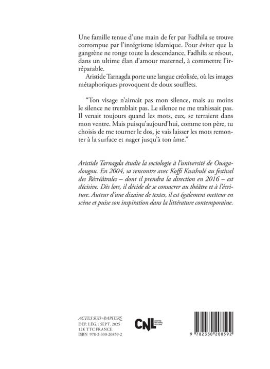 Une famille tenue d'une main de fer par Fadhila se trouve corrompue par l'intégrisme islamique. Pour éviter que la gangrène ne ronge toute la descendance, Fadhila se résout, dans un ultime élan d'amour maternel, à commettre l'irréparable. Aristide Tarnagda porte une langue créolisée, où les images métaphoriques provoquent de doux soufflets. "Ton visage n'aimait pas mon silence, mais au moins le silence ne tremblait pas. Le silence ne me trahissait pas. Il venait toujours quand les mots, eux, se terraient dans mon ventre. Mais puisqu'aujourd'hui, comme ton père, tu choisis de me tourner le dos, je vais laisser les mots remonter à la surface et nager jusqu'à ton âme."