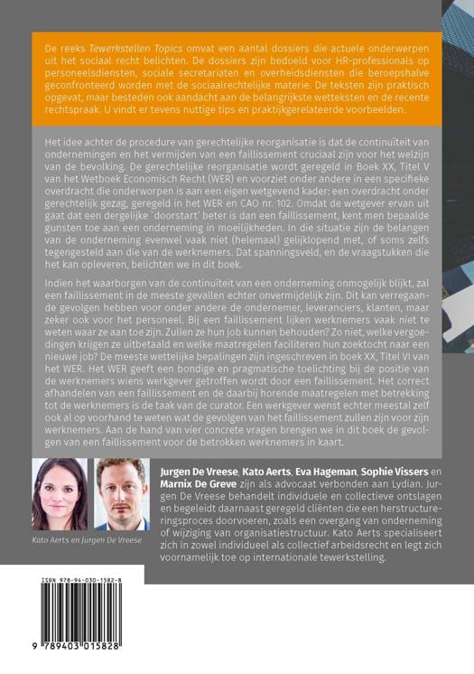 Indien het waarborgen van de continuïteit van een onderneming onmogelijk blijkt, zal een faillissement in de meeste gevallen echter onvermijdelijk zijn. Dit kan verregaande gevolgen hebben voor onder andere de ondernemer, leveranciers, klanten, maar zeker ook voor het personeel. Bij een faillissement lijken werknemers vaak niet te weten waar ze aan toe zijn. Zullen ze hun job kunnen behouden? Zo niet, welke vergoedingen krijgen ze uitbetaald en welke maatregelen faciliteren hun zoektocht naar een nieuwe job? De meeste wettelijke bepalingen zijn ingeschreven in boek XX, Titel VI van het WER. Het WER geeft een bondige en pragmatische toelichting bij de positie van de werknemers wiens werkgever getroffen wordt door een faillissement. Het correct afhandelen van een faillissement en de daarbij horende maatregelen met betrekking tot de werknemers is de taak van de curator. Een werkgever wenst echter meestal zelf ook al op voorhand te weten wat de gevolgen van het faillissement zullen zijn voor zijn werknemers. Aan de hand van vier concrete vragen brengen we in dit boek de gevolgen van een faillissement voor de betrokken werknemers in kaart.