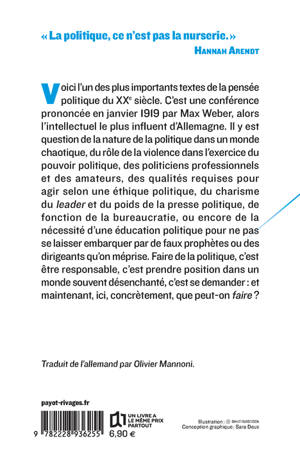 La politique est-elle une affaire de professionnels ? Faut-il vivre et mourir pour des idées ? Ce texte, l'un des plus importants de la pensée politique du XXe siècle, est consacré à la passion politique et au métier de politique. Weber y analyse les dangers de la politique professionnelle et le risque d'un retour à la violence. On y trouvera aussi la distinction célèbre entre l'éthique de la conviction et l'éthique de la responsabilité. La conviction, c'est la passion, c'est croire que la politique concerne des idées pour lesquelles vous vivrez et mourrez ; et la responsabilité, c'est prendre les conséquences au sérieux, se demander ce qui se passera si l'on vit et si l'on meurt selon ces idées.