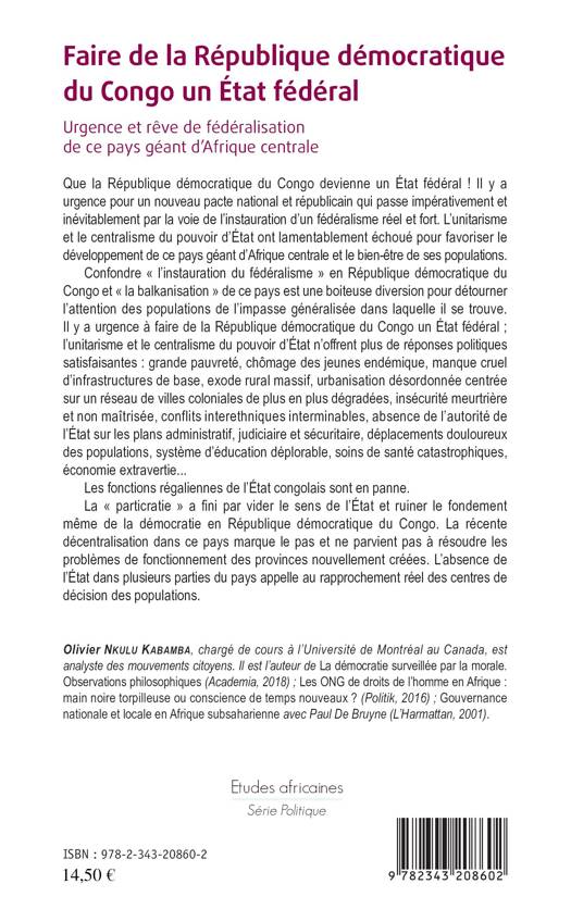Confondre « l'instauration du fédéralisme » en République démocratique du Congo et « la balkanisation » de ce pays est une boiteuse diversion pour détourner l'attention des populations de l'impasse généralisée dans laquelle il se trouve. Il y a urgence à faire de la République démocratique du Congo un État fédéral ; l'unitarisme et le centralisme du pouvoir d'État n'offrent plus de réponses politiques satisfaisantes : grande pauvreté, chômage des jeunes endémique, manque cruel d'infrastructures de base, exode rural massif, insécurité meurtrière et non maîtrisée, conflits interethniques interminables etc.