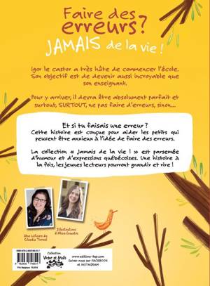 Une histoire pour tous ceux et celles qui détestent se tromper ! Igor le castor a très hâte de commencer l’école. Son objectif est de devenir aussi incroyable que son enseignant. Pour y arriver, il devra être absolument parfait et surtout, SURTOUT, ne pas faire d’erreurs, sinon... Et si tu faisais une erreur ? Cette histoire est conçue pour aider les petits qui peuvent être anxieux à l’idée de faire des erreurs. La collection « Jamais de la vie ! » est parsemée d’humour et d’expressions québécoises. Une histoire à la fois, les jeunes lecteurs pourront grandir et rire !