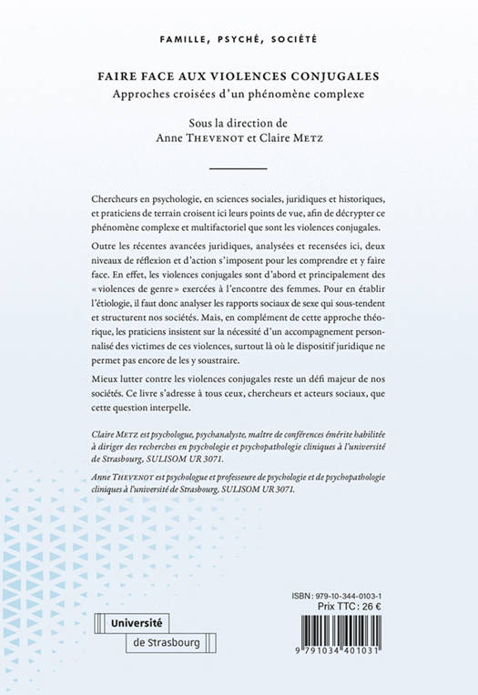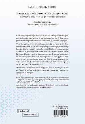 L'ouvrage propose un panorama inédit des violences conjugales, croisant les approches d'historiens, de juristes, de psychologues, de sociologues, afin d'éclairer et de comprendre ce phénomène complexe et si persistant malgré l'évolution des lois et des politiques mises en œuvre, dont témoigne le dernier Grenelle. Il s'adresse en ce sens à tous, praticiens, chercheurs, décideurs, soit toute personne impliquée dans la lutte contre les violences conjugales. Explorant des contextes variés au niveau des sociétés, et intimes au niveau des couples, il vise à ouvrir de nouvelles pistes de réflexion à l'appui des politiques publiques mises en place pour lutter contre ce fléau de notre temps.