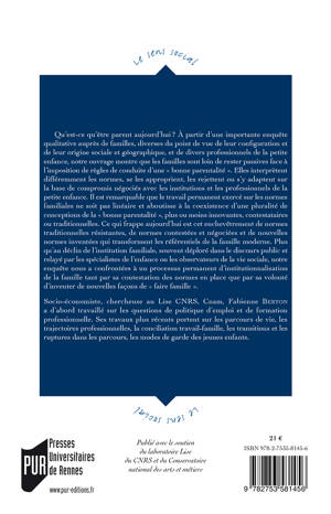 Qu'est-ce qu'être parent aujourd'hui ? À partir d'une importante enquête qualitative auprès de familles et de professionnels de la petite enfance, ce livre montre que les familles sont loin de rester passives face à l'imposition de règles de conduite d'une « bonne parentalité ». Elles interprètent différemment les normes, se les approprient, les rejettent ou s'y adaptent sur la base de compromis négociés avec les institutions et les professionnels de la petite enfance. Plus qu'au déclin de la famille souvent déploré dans le discours public, cette enquête confronte à son processus permanent d'institutionnalisation.
