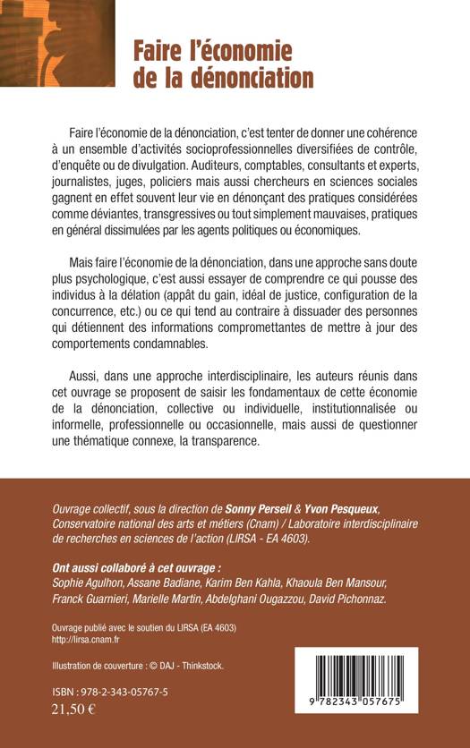 Auditeurs, comptables, consultants et experts, journalistes, juges, policiers, mais aussi chercheurs en sciences sociales gagnent souvent leur vie en dénonçant des pratiques considérées comme déviantes, transgressives ou tout simplement mauvaises, pratiques en général dissimulées par les agents politiques ou économiques. Faire l'économie de la dénonciation dans une approche sans doute plus psychologique, c'est essayer de comprendre ce qui pousse des individus à la délation. Ces contributions se proposent de saisir les fondamentaux de cette économie, mais aussi de questionner une thématique connexe, la transparence.