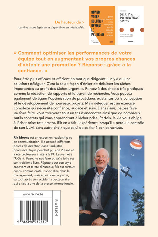 Pour être plus efficace et efficient en tant que dirigeant, il n'y a qu'une solution : déléguer. C'est la seule façon d'éviter de délaisser les tâches importantes au profit des tâches urgentes. Pensez à des choses très pratiques comme la rédaction de rapports et le travail de recherche. Vous pouvez également déléguer l'optimisation de procédures existantes ou la conception et le développement de nouveaux projets. Mais déléguer est un exercice complexe qui nécessite confiance, audace et suivi. Dans Faire, ne pas faire ou faire faire, vous trouverez tout un tas d'anecdotes ainsi que de nombreux outils concrets qui vous apprendront à lâcher prise. Parfois, la vie vous oblige à lâcher prise totalement. Rik en a fait l'expérience lorsqu'il a perdu le contrôle de son ULM, sans autre choix que celui de se fier à son parachute.