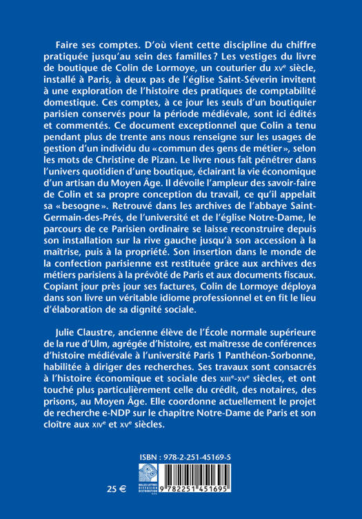Faire ses comptes. D'ou vient cette discipline du chiffre pratiquee jusqu'au sein des familles ? Les vestiges du livre de boutique de Colin de Lormoye, un couturier du XVe siecle, installe a Paris, a deux pas de l'eglise Saint-Severin invitent a une exploration de l'histoire des pratiques de comptabilite domestique. Ces comptes, a ce jour les seuls d'un boutiquier parisien conserves pour la periode medievale, sont ici edites et commentes. Ce document exceptionnel que Colin a tenu pendant plus de trente ans nous renseigne sur les usages de gestion d'un individu du commun des gens de metier , selon les mots de Christine de Pizan. Le livre nous fait penetrer dans l'univers quotidien d'une boutique, eclairant la vie economique d'un artisan du Moyen Age. Il devoile l'ampleur des savoir-faire de Colin et sa propre conception du travail, ce qu'il appelait sa besogne . Retrouve dans les archives de l'abbaye Saint-Germain-des-Pres, de l'universite et de l'eglise Notre-Dame, le parcours de ce Parisien ordinaire se laisse reconstruire depuis son installation sur la rive gauche jusqu'a son accession a la maitrise, puis a la propriete. Son insertion dans le monde de la confection parisienne est restituee grace aux archives des metiers parisiens a la prevote de Paris et aux documents fiscaux. Copiant jour pres jour ses factures, Colin de Lormoye deploya dans son livre un veritable idiome professionnel et en fit le lieu d'elaboration de sa dignite sociale.