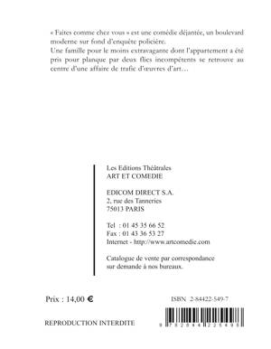 Faites comme chez vous est une comédie déjantée, un boulevard moderne sur fond d'enquête policière. Une famille pour le moins extravagante dont l'appartement a été pris pour planque par deux flics incompétents se retrouve au centre d'une affaire de trafic d'oeuvres d'art...