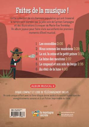 L'éveil musical en misant sur six comptines traditionnelles. Une collection de six chansons populaires qui ont traversé le temps sont portées par une jolie voix et des illustrations à croquer. Un album joyeux pour faire vivre aux enfants les premiers moments d'éveil musical. Au menu: Les crocodiles, Nous sommes les musiciens, Le roi, la reine et le petit prince, La laine des moutons, Le crapaud et son solo de banjo et Au clair de la lune (en duo avec Daniel Lavoie). L'album musical comprend 6 chansons. En plus du disque, un code unique pour le téléchargement des enregistrements est inclus. Faites de la musique! (Let's Make Some Music!) features rich vocals and impressive musicianship that will certainly appeal to young and old alike. A unique code for the digital download of the recordings is also included.