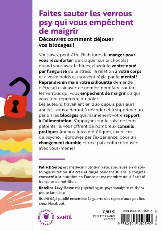 Reprendre en main votre silhouette demande d’être au clair avec ce dernier, pour faire sauter les verrous qui vous empêchent de maigrir ou qui vous font reprendre du poids. Les auteurs, travaillant en duo depuis plusieurs années, vous aideront à décoder et à supprimer un par un les blocages qui malmènent votre rapport à l’alimentation. S’appuyant sur le suivi de leurs patients, ils vous offrent de nombreux conseils pratiques (menus, infos diététiques, exercices de psycho…) éprouvés par l’expérience, pour un changement durable et une paix enfin retrouvée avec vous-même !