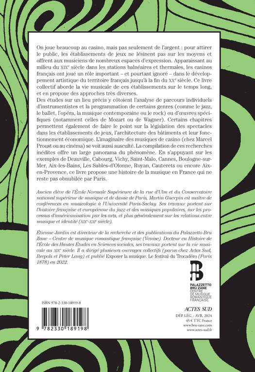On joue beaucoup au casino, mais pas seulement de l'argent : pour attirer le public, les établissements de jeux ne lésinent pas sur les moyens et offrent aux musiciens de nombreux espaces d'expression. Apparaissant au milieu du XIXe siècle dans les stations balnéaires et thermales, les casinos français ont joué un rôle important - et pourtant ignoré - dans le développement artistique du territoire français jusqu'à la fin du XXe siècle. Ce livre collectif aborde la vie musicale de ces établissements sur le temps long, et en propose des approches très diverses. Des études sur un lieu précis y côtoient l'analyse de parcours individuels d'instrumentistes et la programmation de certains genres (comme le jazz, le ballet, l'opéra, la musique contemporaine ou le rock) ou d'oeuvres spécifiques (notamment celles de Mozart ou de Wagner). Certains chapitres permettent également de faire le point sur la législation des spectacles dans les établissements de jeux, l'architecture des bâtiments et leur fonctionnement économique. L'imaginaire des musiques de casino (chez Marcel Proust ou au cinéma) se voit aussi ausculté. La compilation de ces recherches inédites offre un large panorama du phénomène. En s'appuyant sur les exemples de Deauville, Cabourg, Vichy, Saint-Malo, Cannes, Boulogne-sur-Mer, Aix-les-Bains, Les Sables-d'Olonne, Royan, Cauterets ou encore Aix-en-Provence, ce livre propose une histoire de la musique en France qui ne reste pas obnubilée par Paris.