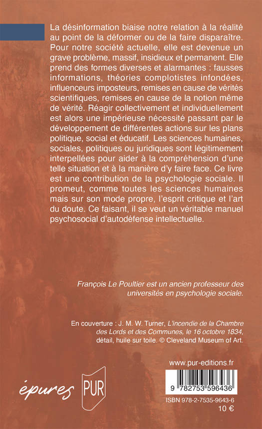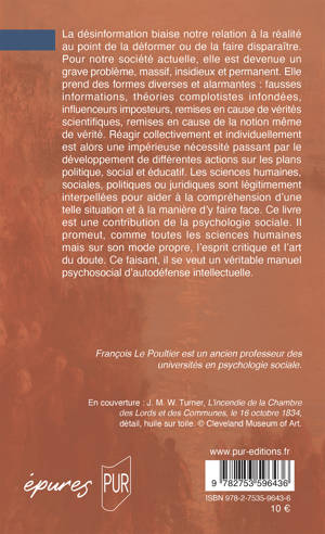 La désinformation biaise notre relation à la réalité au point de la déformer ou de la faire disparaître. Pour notre société actuelle, elle est devenue un grave problème, massif, insidieux et permanent. Elle prend des formes diverses et alarmantes : fausses informations, théories complotistes infondées, influenceurs imposteurs, remises en cause de vérités scientifiques, remises en cause de la notion même de vérité. Réagir collectivement et individuellement est alors une impérieuse nécessité passant par le développement de différentes actions sur les plans politique, social et éducatif. Les sciences humaines, sociales, politiques ou juridiques sont légitimement interpellées pour aider à la compréhension d’une telle situation et à la manière d’y faire face. Ce livre est une contribution de la psychologie sociale. Il promeut, comme toutes les sciences humaines mais sur son mode propre, l’esprit critique et l’art du doute. Ce faisant, il se veut un véritable manuel psychosocial d’autodéfense intellectuelle.