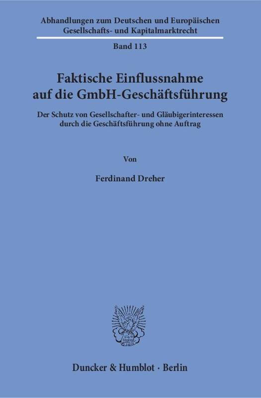 Das Problem der faktischen Geschäftsführung und die mit dieser Rechtsfigur verknüpften Rechtsfolgen beschäftigen Rechtsprechung und Literatur seit geraumer Zeit, ohne dass bisher eine gänzlich überzeugende Lösung gefunden wurde. Aufbauend auf einer eingehenden Analyse des bisherigen Forschungsstands und einem rechtsvergleichenden Blick nach England schlägt die Arbeit daher einen vollständigen Neuansatz zur Lösung der Problematik vor. Hierzu wird ein Verantwortlichkeitsregime für faktische Einflussnahme auf die GmbH-Geschäftsführung aus den Regeln über die Geschäftsführung ohne Auftrag hergeleitet. Diese Lösung wird den Besonderheiten der faktischen Geschäftsführerstellung besser gerecht als die bisher überwiegend vorgeschlagene entsprechende Anwendung der Pflichten des bestellten Geschäftsführers und kann daher auch den notwendigen Schutz der Gesellschafter und Gläubiger der betroffenen Gesellschaft vor Schädigungen durch den faktischen Geschäftsführer besser gewährleisten.