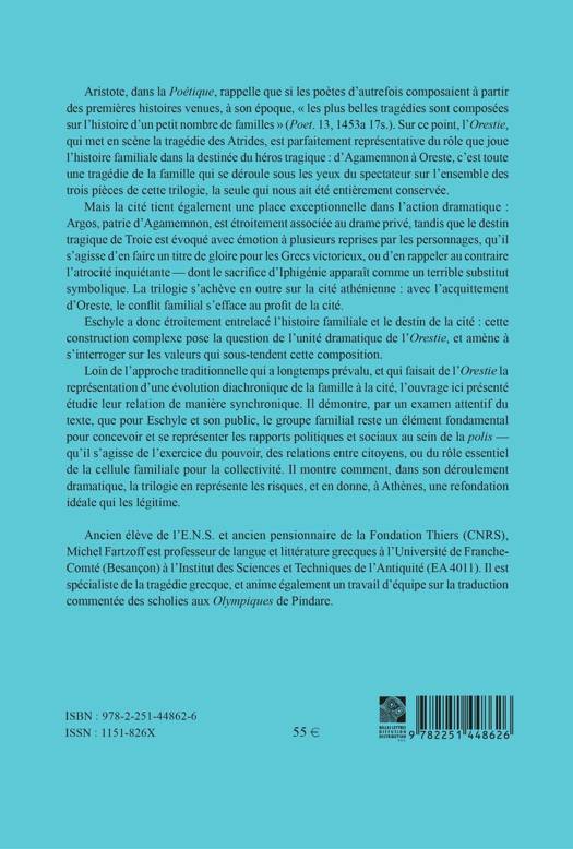 English Summary: Far from the traditional approach that has long prevailed, and which made the Oresteia the representation of a diachronic evolution from family to city, the work presented here studies their relationship synchronically. He shows, through a careful examination of the text, that for Aeschylus and his audience, the family group remains a fundamental element in conceiving and representing political and social relations within the polis - be it the exercise power, relationships between citizens, or the essential role of the family unit for the community. It shows how, in its dramatic course, the trilogy represents the risks, and gives, in Athens, an ideal refoundation that legitimizes them. French Description: Aristote, dans la Poetique, rappelle que si les poetes d'autrefois composaient a partir des premieres histoires venues, a son epoque, les plus belles tragedies sont composees sur l'histoire d'un petit nombre de familles (Poet. 13, 1453a 17s.). Sur ce point, l'Orestie, qui met en scene la tragedie des Atrides, est parfaitement representative du role que joue l'histoire familiale dans la destinee du heros tragique: d'Agamemnon a Oreste, c'est toute une tragedie de la famille qui se deroule sous les yeux du spectateur sur l'ensemble des trois pieces de cette trilogie, la seule qui nous ait ete entierement conservee. Mais la cite tient egalement une place exceptionnelle dans l'action dramatique: Argos, patrie d'Agamemnon, est etroitement associee au drame prive, tandis que le destin tragique de Troie est evoque avec emotion a plusieurs reprises par les personnages, qu'il s'agisse d'en faire un titre de gloire pour les Grecs victorieux, ou d'en rappeler au contraire l'atrocite inquietante - dont le sacrifice d'Iphigenie apparait comme un terrible substitut symbolique. La trilogie s'acheve en outre sur la cite athenienne: avec l'acquittement d'Oreste, le conflit familial s'efface au profit de la cite. Eschyle a donc etroitement entrelace l'histoire familiale et le destin de la cite: cette construction complexe pose la question de l'unite dramatique de l'Orestie, et amene a s'interroger sur les valeurs qui sous-tendent cette composition. Loin de l'approche traditionnelle qui a longtemps prevalu, et qui faisait de l'Orestie la representation d'une evolution diachronique de la famille a la cite, l'ouvrage ici presente etudie leur relation de maniere synchronique. Il demontre, par un examen attentif du texte, que pour Eschyle et son public, le groupe familial reste un element fondamental pour concevoir et se representer les rapports politiques et sociaux au sein de la polis - qu'il s'agisse de l'exercice du pouvoir, des relations entre citoyens, ou du role essentiel de la cellule familiale pour la collectivite. Il montre comment, dans son deroulement dramatique, la trilogie en represente les risques, et en donne, a Athenes, une refondation ideale qui les legitime.