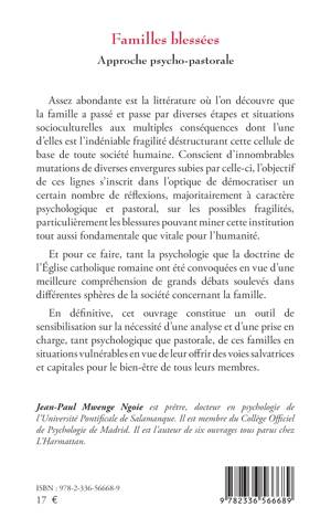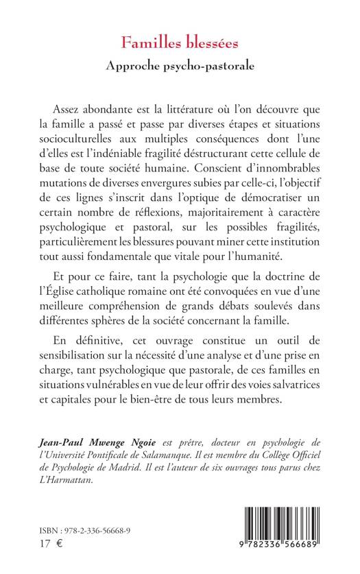 Assez abondante est la littérature où l'on découvre que la famille a passé et passe par diverses étapes et situations socioculturelles aux multiples conséquences dont l'une d'elles est l'indéniable fragilité déstructurant cette cellule de base de toute société humaine. Conscient d'innombrables mutations de diverses envergures subies par celle-ci, l'objectif de ces lignes s'inscrit dans l'optique de démocratiser un certain nombre de réflexions, majoritairement à caractère psychologique et pastoral, sur les possibles fragilités, particulièrement les blessures pouvant miner cette institution tout aussi fondamentale que vitale pour l'humanité. Et pour ce faire, tant la psychologie que la doctrine de l'Église catholique romaine ont été convoquées en vue d'une meilleure compréhension de grands débats soulevés dans différentes sphères de la société concernant la famille. En définitive, cet ouvrage constitue un outil de sensibilisation sur la nécessité d'une analyse et d'une prise en charge, tant psychologique que pastorale, de ces familles en situations vulnérables en vue de leur offrir des voies salvatrices et capitales pour le bien-être de tous leurs membres.