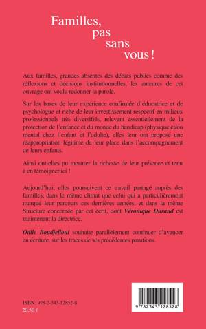 Aux familles, grandes absentes des débats publics comme des réflexions et décisions institutionnelles, les auteures de cet ouvrage ont voulu redonner la parole. Sur les bases de leur expérience confirmée d'éducatrice et de psychologue et riche de leur investissement respectif en milieux professionnels très diversifiés, relevant essentiellement de la protection de l'enfance et du monde du handicap (physique et/ou mental chez l'enfant et l'adulte), elles leur ont proposé une réappropriation légitime de leur place dans l'accompagnement de leurs enfants. Aujourd'hui, elles poursuivent ce travail partagé auprès des familles, dans la même Structure concernée par cet écrit.