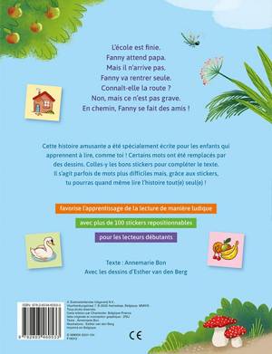 L'école est finie. Fanny attend papa. Mais il n'arrive pas. Fanny va rentrer seule. Connaît-elle la route ? Non, mais ce n'est pas grave. En chemin, Fanny se fait des amis ! Cette histoire amusante a été spécialement écrite pour les enfants qui apprennent à lire, comme toi ! Certains mots ont été remplacés par des dessins. Colles-y les bons stickers pour compléter le texte. Il s'agit parfois de mots plus difficiles mais, grâce aux stickers, tu pourras quand même lire l'histoire tout(e) seul(e) ! - favorise l'apprentissage de la lecture de manière ludique - avec plus de 100 stickers repositionnables - pour les lecteurs débutants CP/1re primaire - Niveau 1 Texte : Annemarie Bon Avec les dessins d'Esther van den Berg