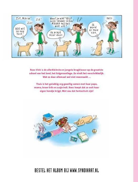 Roos Vink is de allerkleinste en jongste brugklasser op de grootste school van het land, het Enigmacollege. Ze vindt het verschrikkelijk. Wat ze daar allemaal wel niet meemaakt ... Thuis is het gelukkig erg gezellig samen met haar papa, mama, broer Erik en zusje Indi. Roos hoopt dat ze ooit haar eigen hondje krijgt. Wat zou dat fantastisch zijn!