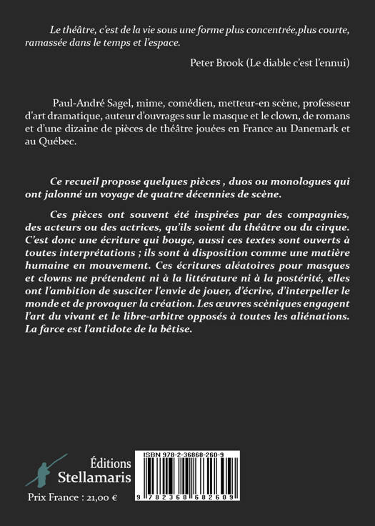 Ce recueil propose quelques pièces , duos ou monologues qui ont jalonné un voyage de quatre décennies de scène. Ces pièces ont souvent été inspirées par des compagnies, des acteurs ou des actrices, qu’ils soient du théâtre ou du cirque. C’est donc une écriture qui bouge, aussi ces textes sont ouverts à toutes interprétations ; ils sont à disposition comme une matière humaine en mouvement. Ces écritures aléatoires pour masques et clowns ne prétendent ni à la littérature ni à la postérité, elles ont l’ambition de susciter l’envie de jouer, d’écrire, d’interpeller le monde et de provoquer la création. Les œuvres scèniques engagent l’art du vivant et le libre-arbitre opposés à toutes les aliénations. La farce est l’antidote de la bêtise.