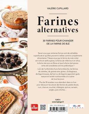 Savez-vous que certaines farines sont de véritables superfoods et qu’elles peuvent s’utiliser comme compléments alimentaires ? Savez-vous que la farine de maïs violet est riche en anthocyanes, la farine de millet brun en silice, la farine de coco en fibres et que la farine de banane verte est considérée comme prébiotique ? Loin de l’uniformité d’une farine blanche, les farines de céréales, de graines sans gluten, d’oléagineux, de légumineuses, de fruit ou de légume apportent goût, texture et variété nutritionnelle à la cuisine de tous les jours. Plus de 30 recettes vous attendent dans ce livre pour découvrir les atouts des farines de patate douce, noix, chanvre, souchet, châtaigne, quinoa, sarrasin, sorgho, pois chiches…