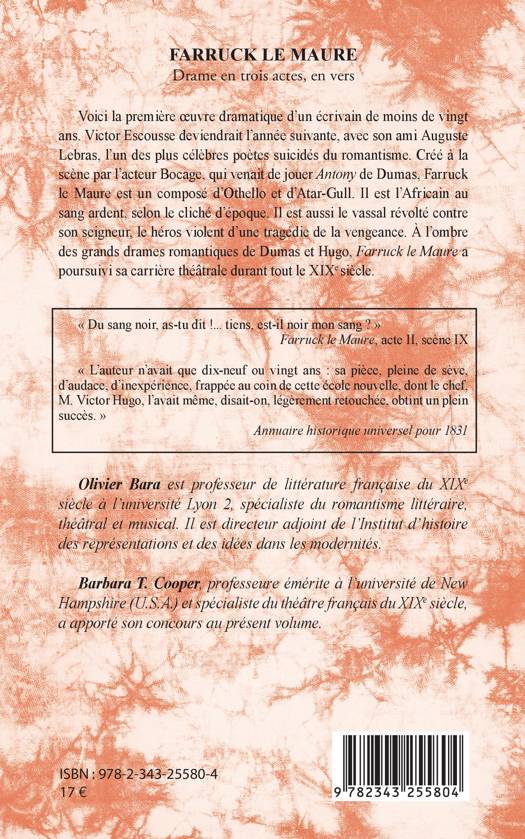 Voici la première oeuvre dramatique d'un écrivain de moins de vingt ans. Victor Escousse deviendrait l'année suivante, avec son ami Auguste Lebras, l'un des plus célèbres poètes suicidés du romantisme. Créé à la scène par l'acteur Bocage, qui venait de jouer Antony de Dumas, Farruck le Maure est un composé d'Othello et d'Atar-Gull. Il est l'Africain au sang ardent, selon le cliché d'époque. Il est aussi le vassal révolté contre son seigneur, le héros violent d'une tragédie de la vengeance. À l'ombre des grands drames romantiques de Dumas et Hugo, Farruck le Maure a poursuivi sa carrière théâtrale durant tout le XIXe siècle.