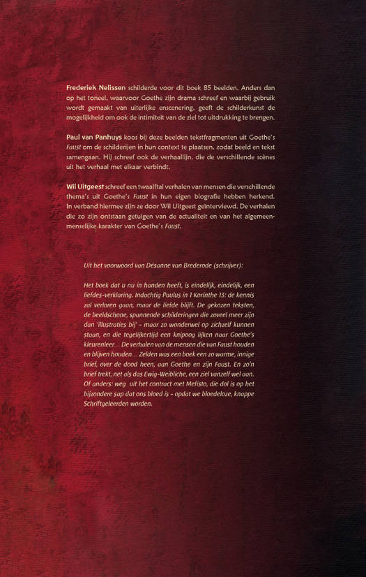 Uit het voorwoord van Désanne van Brederode (schrijver): Het boek dat u nu in handen heeft, is eindelijk, eindelijk, een liefdes-verklaring. Indachtig Paulus in 1 Korinthe 13: de kennis zal verloren gaan, maar de liefde blijft. De gekozen teksten, de beeldschone, spannende schilderingen die zoveel meer zijn dan 'illustraties bij' - maar zo wonderwel op zichzelf kunnen staan, en die tegelijkertijd een knipoog lijken naar Goethe's kleurenleer... De verhalen van de mensen die van Faust houden en blijven houden... Zelden was een boek een zo warme, innige brief, over de dood heen, aan Goethe en zijn Faust. En zo'n brief trekt, net als das Ewig-Weibliche, een ziel vanzelf wel aan. Of anders: weg uit het contract met Mefisto, die dol is op het bijzondere sap dat ons bloed is - opdat we bloedeloze, knappe Schriftgeleerden worden.