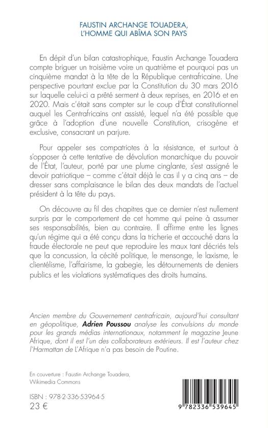 En dépit d’un bilan catastrophique, Faustin Archange Touadera compte briguer un troisième voire un quatrième et pourquoi pas un cinquième mandat à la tête de la République centrafricaine. Une perspective pourtant exclue par la Constitution du 30 mars 2016 sur laquelle celui-ci a prêté serment à deux reprises, en 2016 et en 2020. Mais c'était sans compter sur le coup d’État constitutionnel auquel les Centrafricains ont assisté, lequel n’a été possible que grâce à l’adoption d’une nouvelle Constitution, crisogène et exclusive, consacrant un parjure. Pour appeler ses compatriotes à la résistance, et surtout à s’opposer à cette tentative de dévolution monarchique du pouvoir de l’État, l’auteur, porté par une plume cinglante, s’est assigné le devoir patriotique – comme c’était déjà le cas il y a cinq ans – de dresser sans complaisance le bilan des deux mandats de l’actuel président à la tête du pays. On découvre au fil des chapitres que ce dernier n’est nullement surpris par le comportement de cet homme qui peine à assumer ses responsabilités, bien au contraire. Il affirme entre les lignes qu’un régime qui a été conçu dans la tricherie et accouché dans la fraude électorale ne peut que reproduire les maux tant décriés tels que la concussion, la cécité politique, le mensonge, le laxisme, le clientélisme, l’affairisme, la gabegie, les détournements de deniers publics et les violations systématiques des droits humains.