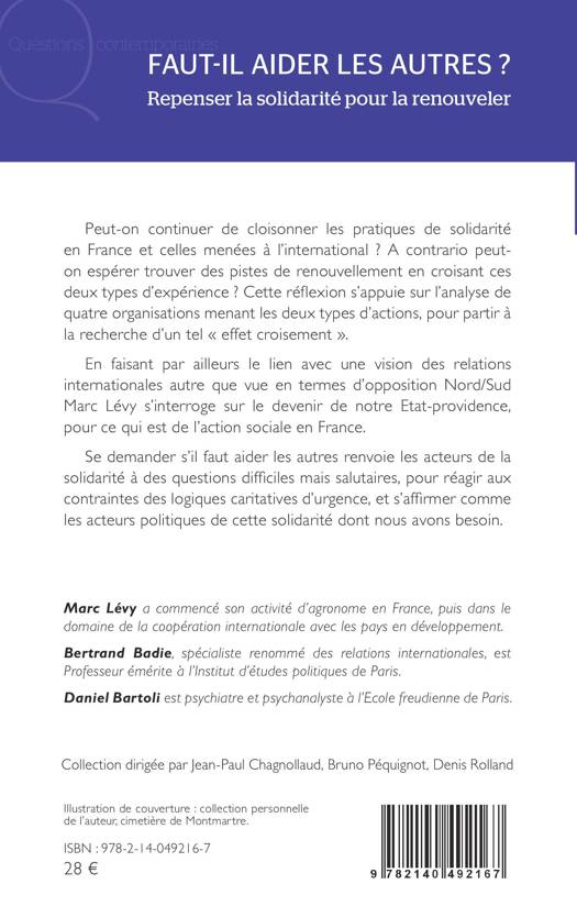 Peut-on continuer de cloisonner les pratiques de solidarité en France et celles menées à l'international ? A contrario peut-on espérer trouver des pistes de renouvellement en croisant ces deux types d'expérience ? Cette réflexion s'appuie sur l'analyse de quatre organisations menant les deux types d'actions, pour partir à la recherche d'un tel « effet croisement ». En faisant par ailleurs le lien avec une vision des relations internationales autre que vue en termes d'opposition Nord/Sud Marc Lévy s'interroge sur le devenir de notre Etat-providence, pour ce qui est de l'action sociale en France. Se demander s'il faut aider les autres renvoie les acteurs de la solidarité à des questions difficiles mais salutaires, pour réagir aux contraintes des logiques caritatives d'urgence, et s'affirmer comme les acteurs politiques de cette solidarité dont nous avons besoin.