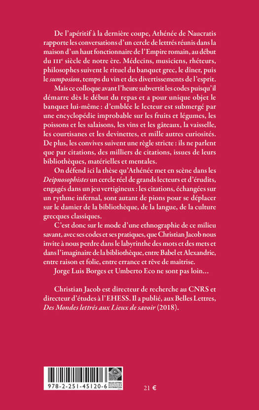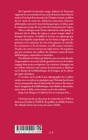 De l’apéritif à la dernière coupe, Athénée de Naucratis rapporte les conversations d’un cercle de lettrés réunis dans la maison d’un haut fonctionnaire de l’Empire romain, au début du IIIe siècle de notre ère. Médecins, musiciens, rhéteurs, philosophes suivent le rituel du banquet grec, le dîner, puis le sumposion, temps du vin et des divertissements de l’esprit.