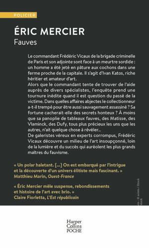 Le commandant Frédéric Vicaux de la brigade criminelle de Paris et son adjointe sont face à un meurtre sordide : un homme a été jeté en pâture aux cochons dans une ferme proche de la capitale. Il s’agit d’Ivan Katos, riche héritier et amateur d’art. Alors que le commandant tente de trouver de l’aide auprès de divers spécialistes, l’enquête prend une tournure inédite quand il est question du passé de la victime. Dans quelles affaires abjectes le collectionneur a-t-il trempé pour être aussi sauvagement assassiné ? Sa fortune cacherait-elle des secrets honteux ? À moins que sa panoplie de tableaux fauves, des Matisse, des Vlaminck, des Dufy, tous plus précieux les uns que les autres, n’ait quelque chose à révéler… De galeristes véreux en experts corrompus, Frédéric Vicaux découvre un milieu de l’art insoupçonné, loin de la lumière et du succès qui auréolent les plus grands maîtres du fauvisme.