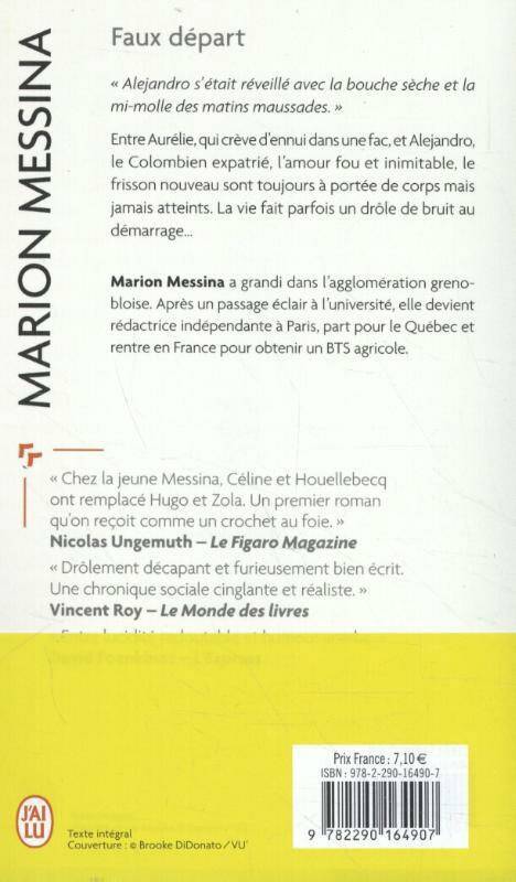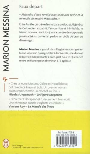 Ma foi, qu'est-ce donc que la vie, la vie qu'on vit ? D'expérience, elle a la douceur d'un airbag en béton et la suavité d'un démaquillant à la soude, la vie ne serait-elle qu'une épaisse couche d'amertume sur le rassis d'une tartine de déception ? Pas moins, pas plus ? C'est en tout cas la démonstration que nous livre Marion Messina, l'Emmanuel Bove de ces temps, dans Faux départ, son premier roman. À ma gauche, Aurélie, à ma droite Alejandro ! Entre la Grenobloise de toute petite extraction qui crève la bulle d'ennui dans une fac facultative, souffre-douleur d'un corps en plein malaise, et le Colombien expatrié, ça s'aime un temps mais ça casse vite. D'aller de Paris en banlieue et de banlieue à Paris, d'œuvrer comme hôtesse d'accueil, de manger triste, coucher cheap et vivre en rase-motte, rencontrer Franck puis Benjamin ne change que peu de choses à l'affaire. Renouer avec Alejandro ne modifie guère la donne : l'amour fou, la vie inimitable, le frisson nouveau sont toujours à portée de corps, mais jamais atteints. Toujours en phase d'approche, jamais d'alunissage. Marion Messina décrit cette frustration au quotidien avec une rigueur d'entomologiste. Que voulez-vous, la vie fait un drôle de bruit au démarrage. Jamais on ne passe la seconde. Faux départ, telle est la règle.