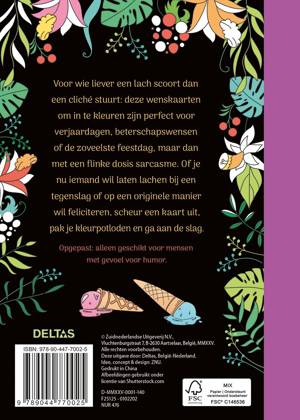 Deze wenskaarten om in te kleuren zijn perfect voor verjaardagen, beterschapswensen of de zoveelste feestdag. Ze bevatten wel een flinke dosis sarcasme. Of je nu iemand wil laten lachen bij een tegenslag of op een originele manier wil feliciteren, scheur een kaart uit, pak je kleurpotloden en ga aan de slag. Opgepast: alleen geschikt voor mensen met gevoel voor humor. De kaarten zijn makkelijk uit te scheuren en gedrukt op extra dik papier om doordrukken te voorkomen. Set van 20 kaarten.