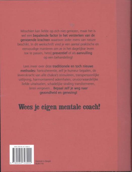 Misschien kan liefde op zich niet genezen, maar het is wel een bepalende factor in het versterken van de genezende krachten waarover ieder mens van nature beschikt. In dit werkschrift vindt u een aantal praktische en eenvoudige manieren om ze in het dagelijkse leven toe te passen, hetzij preventief of als aanvulling op een behandeling! Lees meer over deze traditionele en toch nieuwe methodes: hartcoherentie, zelf je humeur bepalen, de levenskracht van alle chakra's stimuleren, transpersoonlijke uitlijning, harmoniserend ademhalen, onvoorwaardelijke liefde uitwisselen, schadelijke straling transformeren, leren vergeven... Bepaal zelf je weg naar gezondheid en genezing! Wees je eigen mentale coach!