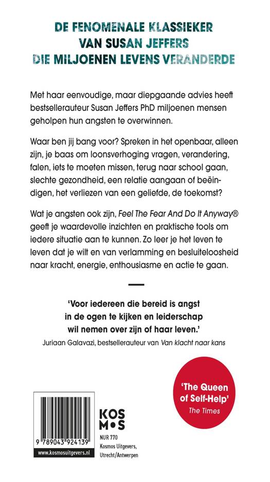 Feel The Fear And Do It Anyway® is de fenomenale klassieker die de levens van miljoenen mensen over de hele wereld veranderde. Dit tijdloze advies is nog altijd relevant: we leven in een tijdperk dat wordt geregeerd door angst. Angst om te falen, om iets te missen, angst voor verandering, de toekomst. Met haar eenvoudige, maar diepgaande advies helpt Susan Jeffers mensen hun angsten te overwinnen, om zo van verlamming en besluiteloosheid naar kracht, energie, enthousiasme en actie te gaan. Dit is de Nederlandse editie van de bestseller die wereldwijd meer dan 4 miljoen keer over de toonbank ging.