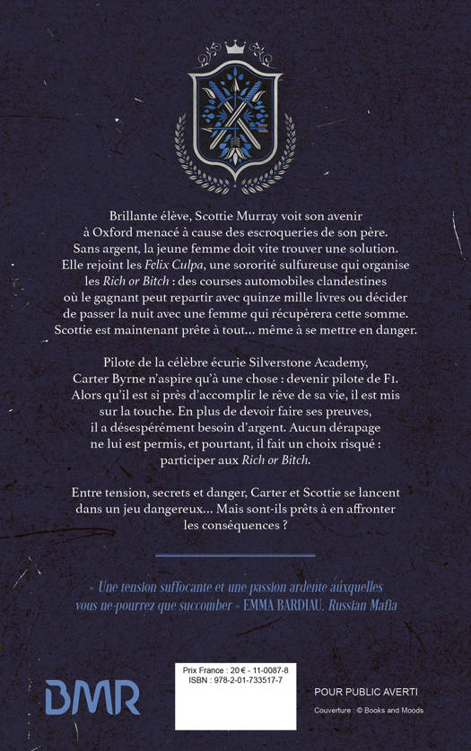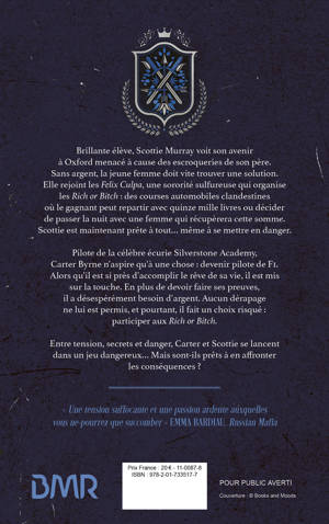 Brillante élève, Scottie Murray voit son avenir à Oxford menacé à cause des escroqueries de son père. Sans argent, la jeune femme doit vite trouver une solution. Pour s’en sortir, elle rejoint les Felix Culpa, une sororité sulfureuse qui organise les Rich or Bitch : des courses clandestines où le gagnant peut repartir avec quinze mille livres ou décider de passer la nuit avec une femme qui récupèrera cette somme. Scottie est maintenant prête à tout… Même à se mettre en danger. Pilote de la célèbre écurie Silverstone Academy, Carter Byrne n’aspire qu’à une chose : devenir pilote de F1. Alors qu’il est si près d’accomplir le rêve de sa vie, il est mis sur la touche. En plus de devoir faire ses preuves, il a désespérément besoin d’argent. Aucun dérapage ne lui est permis, et pourtant, il fait un choix risqué : participer aux Rich or Bitch. Entre tension, secrets et danger, Carter et Scottie se lancent dans un jeu dangereux… Mais sont-ils prêts à en affronter les conséquences ?