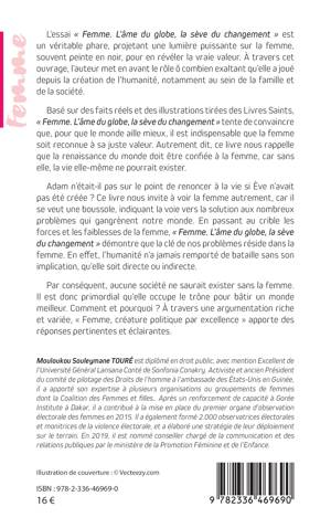 Cet essai projette une lumière puissante sur la femme, souvent peinte en noir, pour en révéler la vraie valeur. L'auteur met en avant le rôle ô combien exaltant qu'elle a joué depuis la création de l'humanité, notamment au sein de la famille et de la société. Basé sur des faits réels et des illustrations tirées des Livres Saints, l'ouvrage tente de convaincre que, pour que le monde aille mieux, il est indispensable que la femme soit reconnue à sa juste valeur. Autrement dit, ce livre nous rappelle que la renaissance du monde doit être confiée à la femme, car sans elle, la vie elle-même ne pourrait exister. Il nous invite à voir la femme autrement, car il se veut une boussole, indiquant la voie vers la solution aux nombreux problèmes qui gangrènent notre monde. En passant au crible les forces et les faiblesses de la femme, Femme. L'âme du globe, la sève du changement démontre que la clé de nos problèmes réside dans la femme. En effet, l'humanité n'a jamais remporté de bataille sans son implication, qu'elle soit directe ou indirecte. Il est donc primordial qu'elle occupe le trône pour bâtir un monde meilleur. Comment et pourquoi ? À travers une argumentation riche et variée, ce livre apporte des réponses pertinentes et éclairantes.