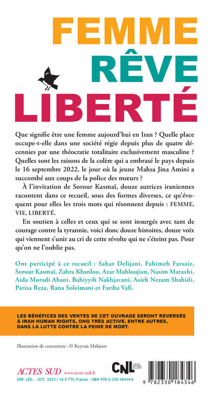 Que signifie être une femme aujourd'hui en Iran ? Quelle place occupe-t-elle dans une société régie depuis plus de quatre décennies par une théocratie totalitaire exclusivement masculine ? Quelles sont les raisons de la colère qui a embrasé le pays depuis le 16 septembre 2022, le jour où la jeune Mahsa Jina Amini a succombé aux coups de la police des moeurs ? À l'invitation de Sorour Kasmaï, douze autrices iraniennes racontent dans ce recueil, sous des formes diverses, ce qu'évoquent pour elles les trois mots qui résonnent depuis : FEMME, VIE, LIBERTÉ. En soutien à celles et ceux qui se sont insurgés avec tant de courage contre la tyrannie, voici donc douze histoires, douze voix qui viennent s'unir au cri de cette révolte qui ne s'éteint pas. Pour qu'on ne l'oublie pas.